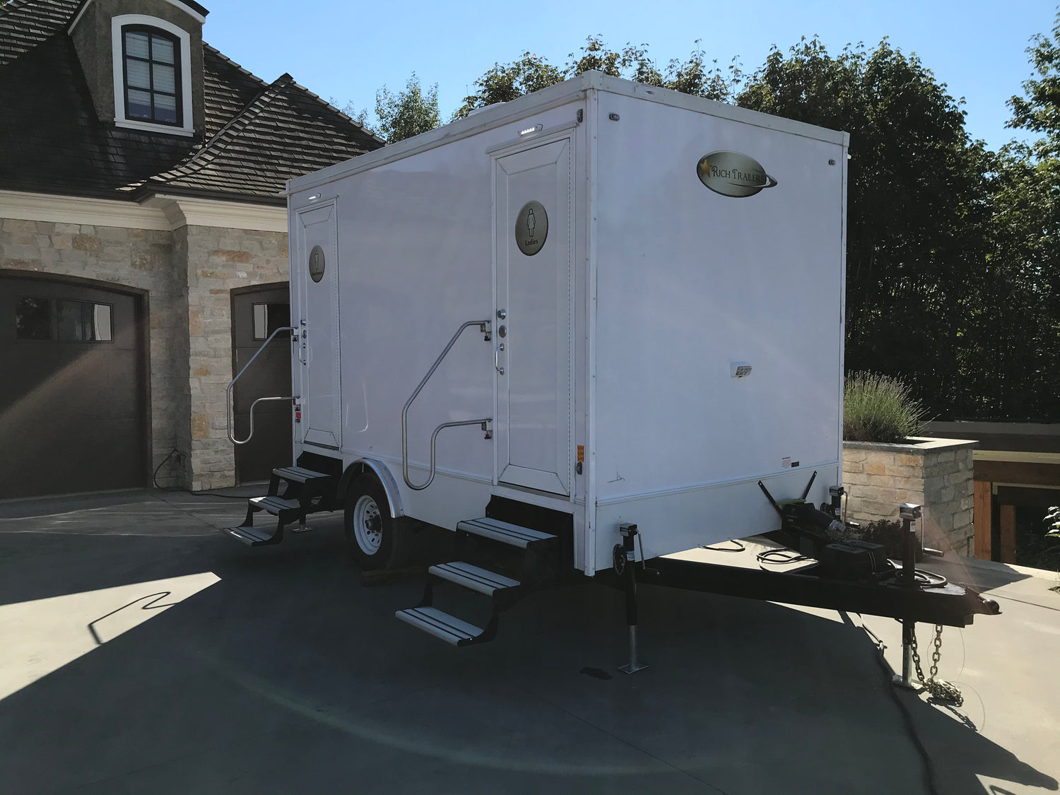 Our 2 stall executive unit includes one mens room with a toilet and urinal plus one womens room with a toilet. Locking doors, mirrors, exterior safe lights at each door make it an elegant and convenient option for all events.